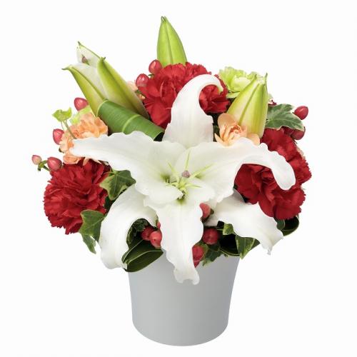 赤い花々の中心で咲く、凛とした白ユリが印象的なアレンジメントです。品のある色合いで大人っぽい雰囲気を持つギフトなので、結婚祝いや還暦祝いなどの特別なお祝いや、フォーマルなシーンでのプレゼントにもおすすめです。