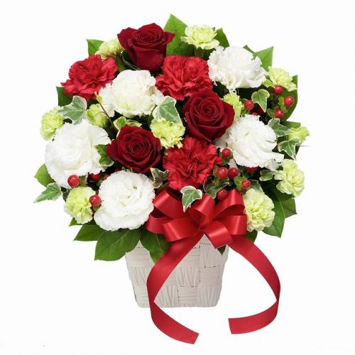 「愛」「美」といった情熱的な花言葉をもつ赤バラと、優しい印象の白い花々を合わせて、上品なアレンジメントに仕上げました。プレゼントにぴったりな、艶やかな赤いリボンも添えています。誕生日や結婚記念日のギフトにはもちろん、季節のイベントの贈り物にもおすすめです。