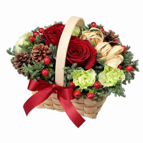 赤バラと松かさを使って冬らしい雰囲気に仕上げた、12月お届け限定のアレンジメントです。ナチュラルで落ち着いた印象なので、幅広い年齢層の方に喜んでいただけるはず。12月生まれの方への誕生日プレゼントや、クリスマスの贈り物におすすめなフラワーギフトです。