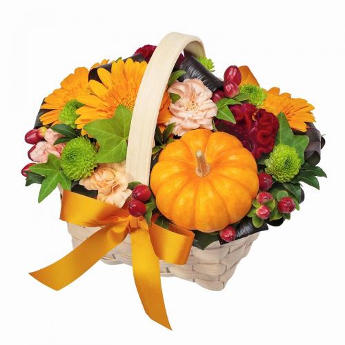 ハロウィンにぴったりなオレンジの花たちを、可愛らしいウッドバスケットに詰めました。ポップな色合いで、お子さまのお誕生日やお祝いにもおすすめです。