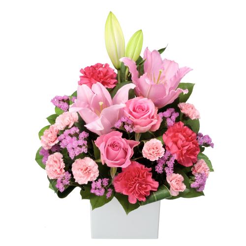 存在感のあるユリが映える、ピンクの花々でまとめたアレンジメント。人気の高いピンクのバラもあわせて、上品な印象に仕上げました。開店祝い・開業祝いなどのフォーマルな贈り物のほか、目上の人やお世話になった方へのプレゼントに最適です。