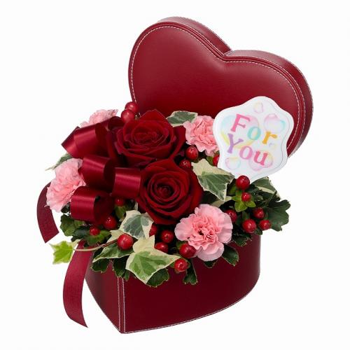 存在感のあるハート型のボックスに花々を生けたアレンジメント。華やかな赤バラを中心に、花と同じ色の赤いリボンを添えました。特に女性へのギフトとして人気があります。結婚記念日や誕生日のプレゼントにぴったりです。