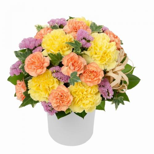 ふんわりと優しげな花々をぎゅっと集めて、柔らかいシルエットに仕上げたアレンジメント。ナチュラルで可愛らしいデザインです。ビタミンカラーでまとめたギフトは、男性・女性を問わずお贈りいただけます。