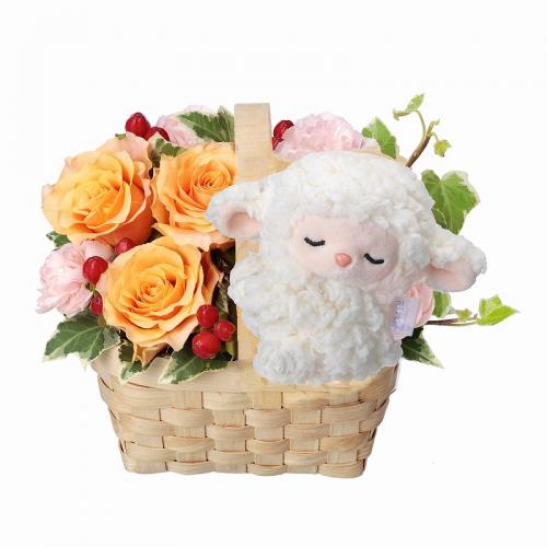 オレンジバラをウッドバスケットにぎゅっと詰め込んで、動物のマスコットを添えました。あたたかみのある色合いのアレンジメントが、お相手の方に笑顔をプレゼントします。マスコットは、パンダ・三毛猫・うさぎなどの豊富なラインナップから1つお付けいたします。どのマスコットが届くかはお楽しみ!