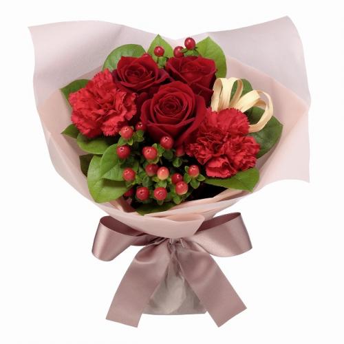 バラを中心に赤系の花々でまとめた、温かみのある雰囲気の花束です。淡いピンクのラッピングペーパーで包んで、可愛らしい印象に仕上げました。飾りやすい小さめなサイズなので、さりげないプレゼントにぴったりです。誕生日や結婚記念日のギフトとして贈れば、きっと喜んでもらえるはず。