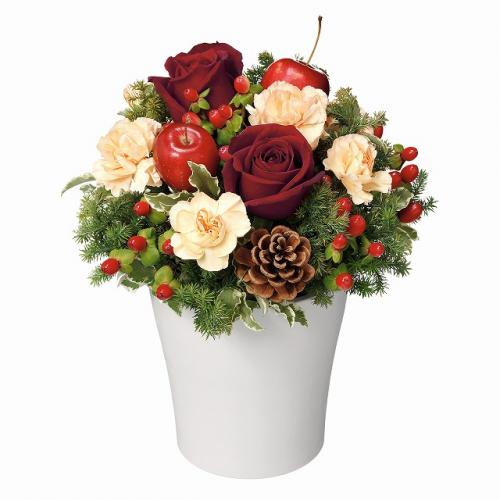 赤バラと冬らしい植物を合わせて、ナチュラルで落ち着いた雰囲気に仕上げたアレンジメント。可愛さと上品さをあわせ持ったデザインなので、幅広い年齢層の方に喜んでいただけるはず。12月生まれの方への誕生日プレゼントや、クリスマスの贈り物におすすめなフラワーギフトです。