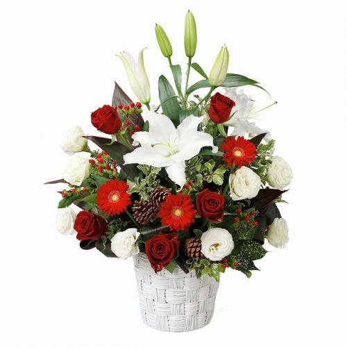 白ユリを中心に、赤バラ・赤ガーベラをたっぷりとあしらいました。フォーマルなシーンでも活躍する、ボリューム満点な冬のアレンジメントです。
