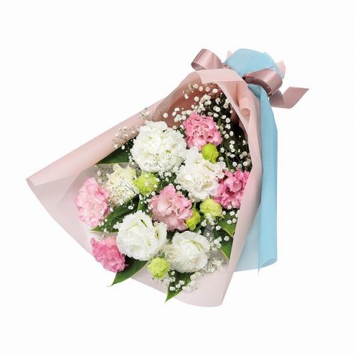 ピンク・白・水色の組み合わせが爽やかな印象の花束です。ピンクと白のトルコキキョウを、明るい色のラッピングで包みました。ボリュームのあるトルコキキョウは、様々なお祝いのシーンで人気があります。目上の人へのプレゼントとしてもおすすめなフラワーギフトです。