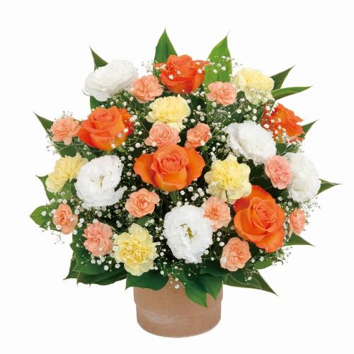 オレンジバラなどの花々をたっぷりと生けた、シンプルでボリュームのあるアレンジメント。オレンジと黄色の組み合わせに白の花を合わせて、親しみやすさの中に上品さがある印象に仕上げたギフトです。目上の人へのプレゼントや、退職祝い、開店祝い・移転祝いの贈り物にぴったりです。