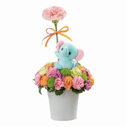 空色ぞうさんのマスコット付きアレンジメント