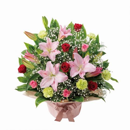 主な花材: ピンクオリエンタル系ユリ、赤バラ、ピンクバラ、グリーンカーネーション