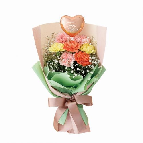 ピンク・オレンジ・黄色のカーネーションを合わせてふんわりと仕上げた、やわらかい雰囲気の花束。爽やかで可憐な花々と、さりげなく「For You」のメッセージを入れたハートのバルーンが、毎日忙しいお母さんを癒してくれます。母の日に感謝と真心をプレゼントする、優しい気持ちを込めたフラワーギフトです。